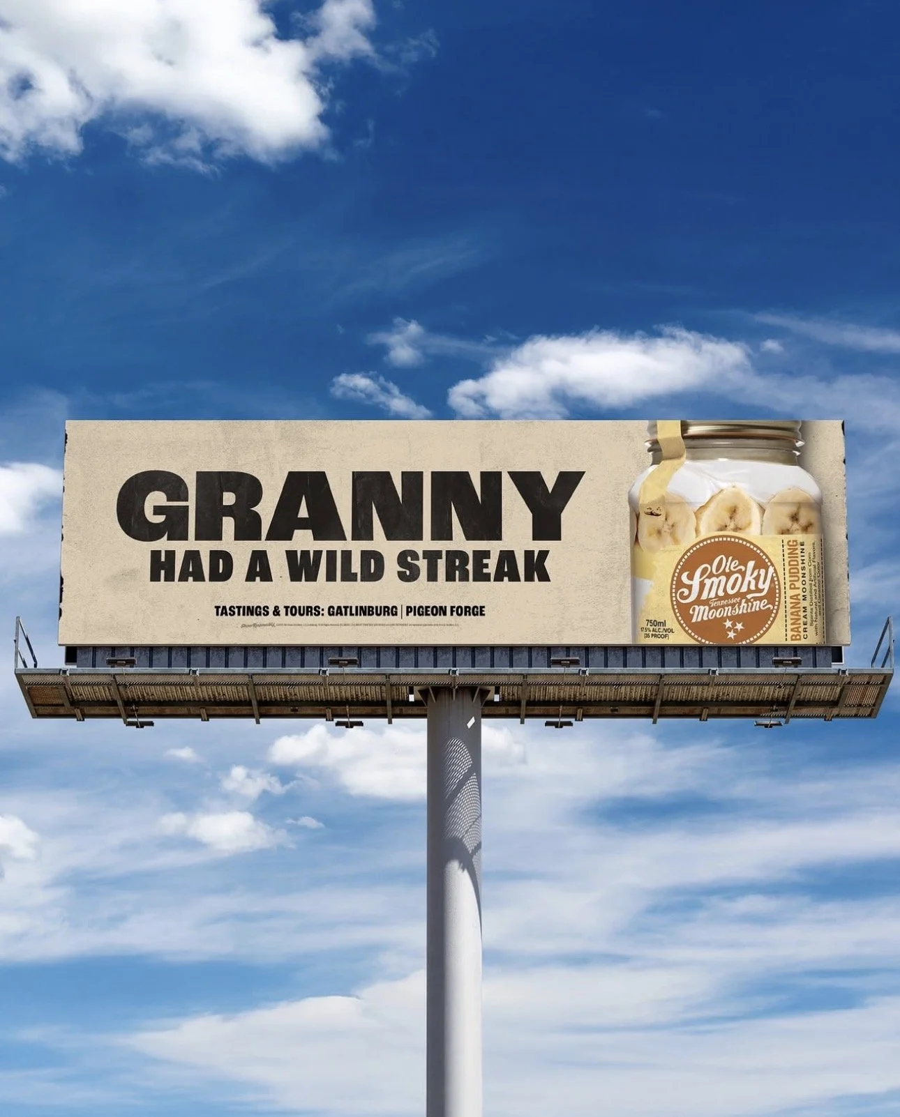 Ole smoky Billboards in east tnMoonshine has always been a taboo liquor… until now. Enter Ole Smoky. From OOH Tday: “Most tourists heading to Gatlinburg & Pigeon Forge usually have no more than pancakes and Dollywood on their mind. But for those who celebrate the rebellious spirit of spirit making in true Smoky Mountain tradition, there’s Ole Smoky Tennessee Moonshine. Tennessee’s first, best, and largest legal distillery. The invite is always there to swing by the holler and raise a jar of White Lightnin’.”